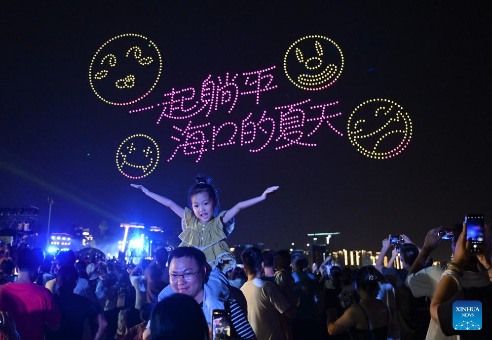 People watch a drone light show at the opening ceremony of the 2025 (26th) Hainan Island Carnival in Haikou, south China's Hainan Province, Aug. 2, 2025. The 2025 (26th) Hainan Island Carnival kicked off on Saturday here. With various activities arranged across the island, the event will last till Aug. 31. (Xinhua/Guo Cheng)