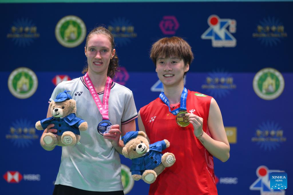 Gold medalist Chen Yufei (R) of China and silver medalist Line Christophersen of Denmark pose on the podium after the women's singles final match at Macao Open badminton tournament 2025 in Macao, south China, Aug. 3, 2025. (Xinhua/Cheong Kam Ka)