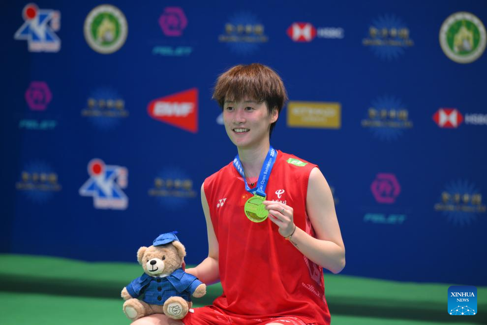 Chen Yufei poses on the podium after the women's singles final match between Chen Yufei of China and Line Christophersen of Denmark at Macao Open badminton tournament 2025 in Macao, south China, Aug. 3, 2025. (Xinhua/Cheong Kam Ka)