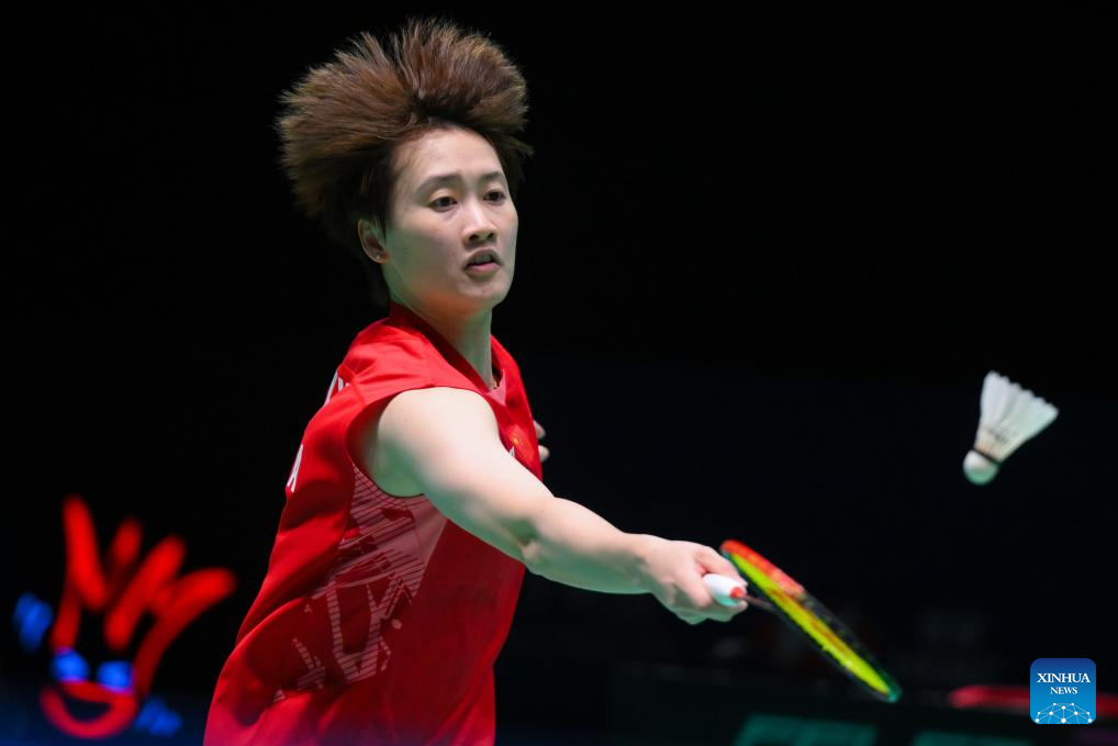 Chen Yufei of China hits a return during the women's singles final match between Chen Yufei of China and Line Christophersen of Denmark at Macao Open badminton tournament 2025 in Macao, south China, Aug. 3, 2025. (Xinhua/Cheong Kam Ka)