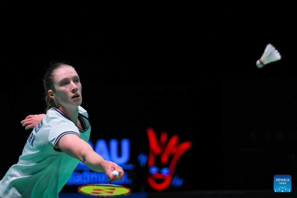 Line Christophersen of Denmark hits a return during the women's singles final match between Chen Yufei of China and Line Christophersen of Denmark at Macao Open badminton tournament 2025 in Macao, south China, Aug. 3, 2025. (Xinhua/Cheong Kam Ka)