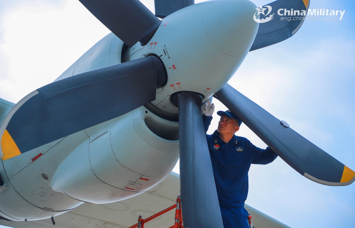 A maintenance technician assigned to an aviation unit under the Chinese PLA Navy inspects the turboprop engine of an aircraft during a round-the-clock flight training exercise held recently. (eng.chinamil.com.cn/Photo by Xing Yun)