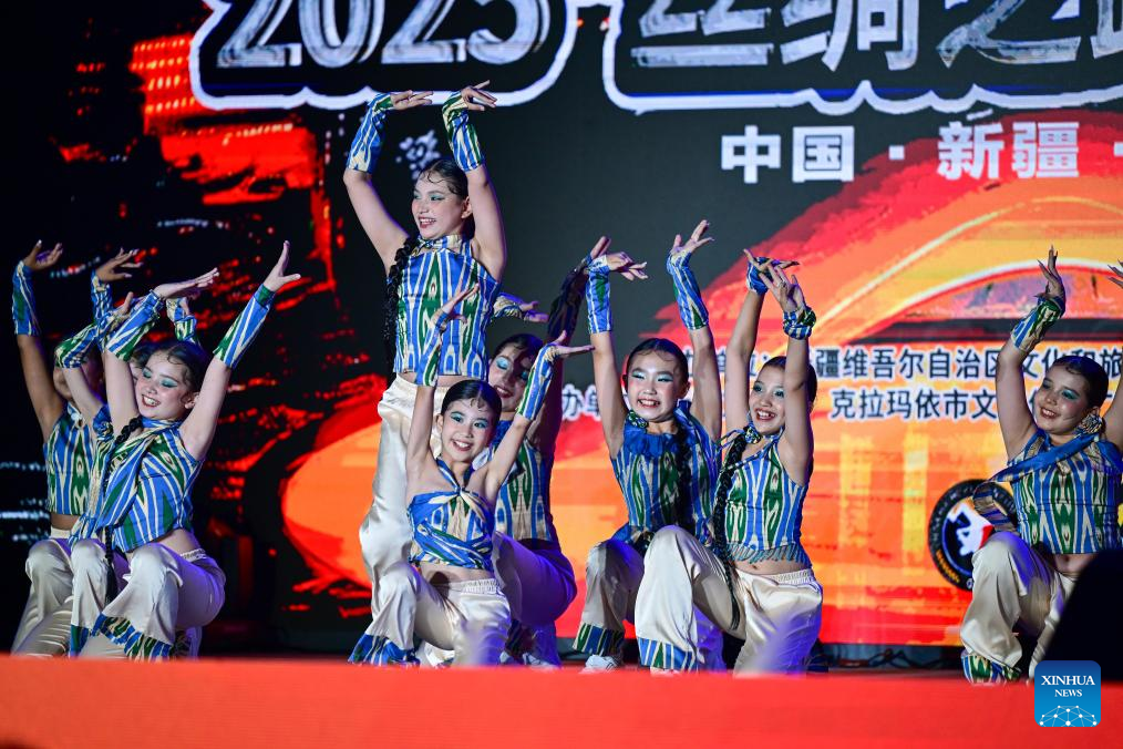 Dancers perform during a street dance show in Karamay, northwest China's Xinjiang Uygur Autonomous Region, Aug. 3, 2025. The street dance show, held as part of the 7th China Xinjiang International Dance Festival, took place on Sunday in Karamay City. More than 600 dancers from home and abroad performed on stage, delivering a captivating show for the audience. (Xinhua/Ding Lei)
