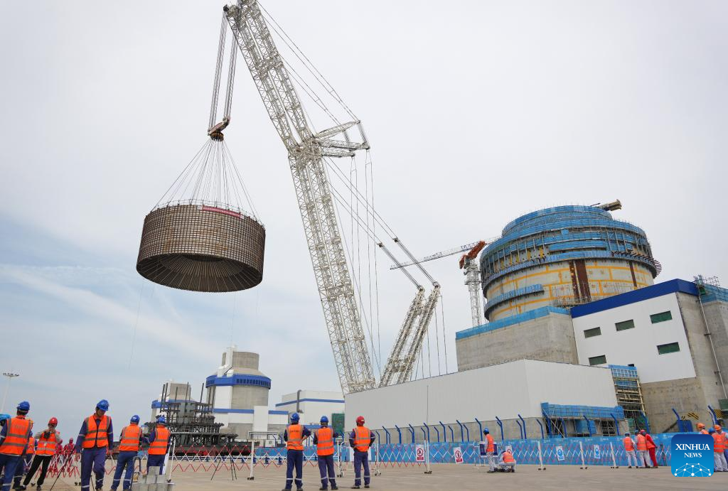 A crane lifts the CB20 module of the nuclear island for the 3rd unit of the Haiyang Nuclear Power Plant in Haiyang, east China's Shandong Province, Aug. 4, 2025. The CB20 module was successfully lifted and positioned on Monday, marking the completion of all major module installations for the 3rd unit of the Haiyang Nuclear Power Plant and the start of equipment installation and commissioning phase. (Photo by Tang Ke/Xinhua)