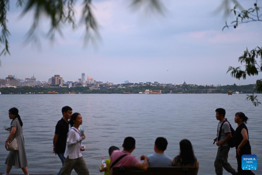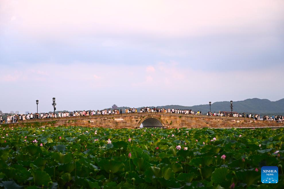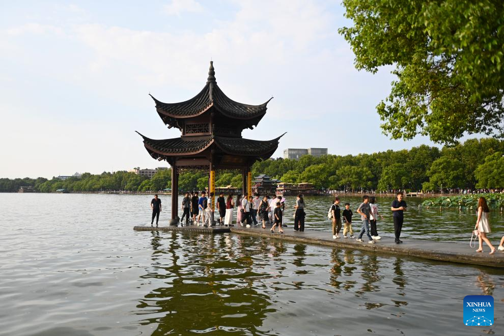 Tourists visit the West Lake scenic spot in Hangzhou, east China's Zhejiang Province, Aug. 3, 2025. (Xinhua/Mao Zhu)
