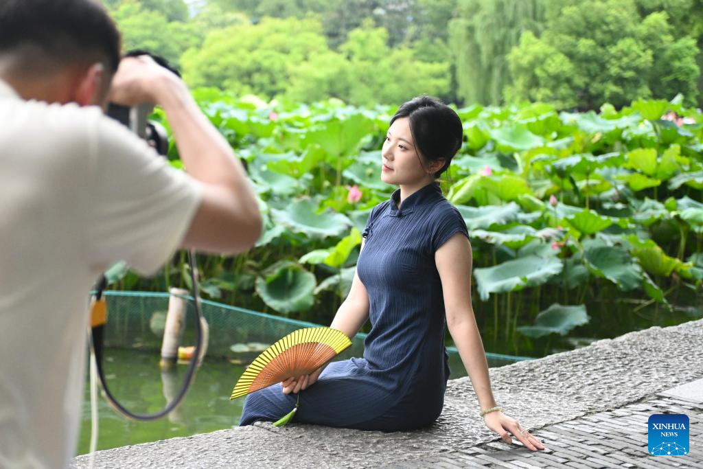 A tourist poses for photos at the West Lake scenic spot in Hangzhou, east China's Zhejiang Province, Aug. 3, 2025. (Xinhua/Mao Zhu)