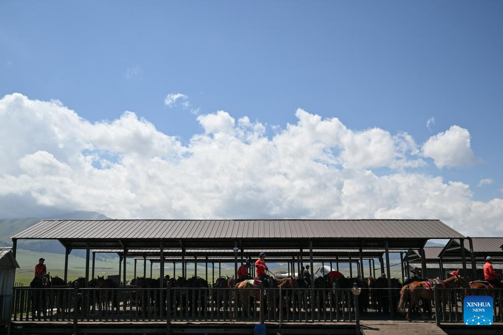 Riders prepare to welcome tourists on their horseback on the Narat grassland in Ili Kazak Autonomous Prefecture, northwest China's Xinjiang Uygur Autonomous Region, Aug. 3, 2025. (Xinhua/Xin Yuewei)