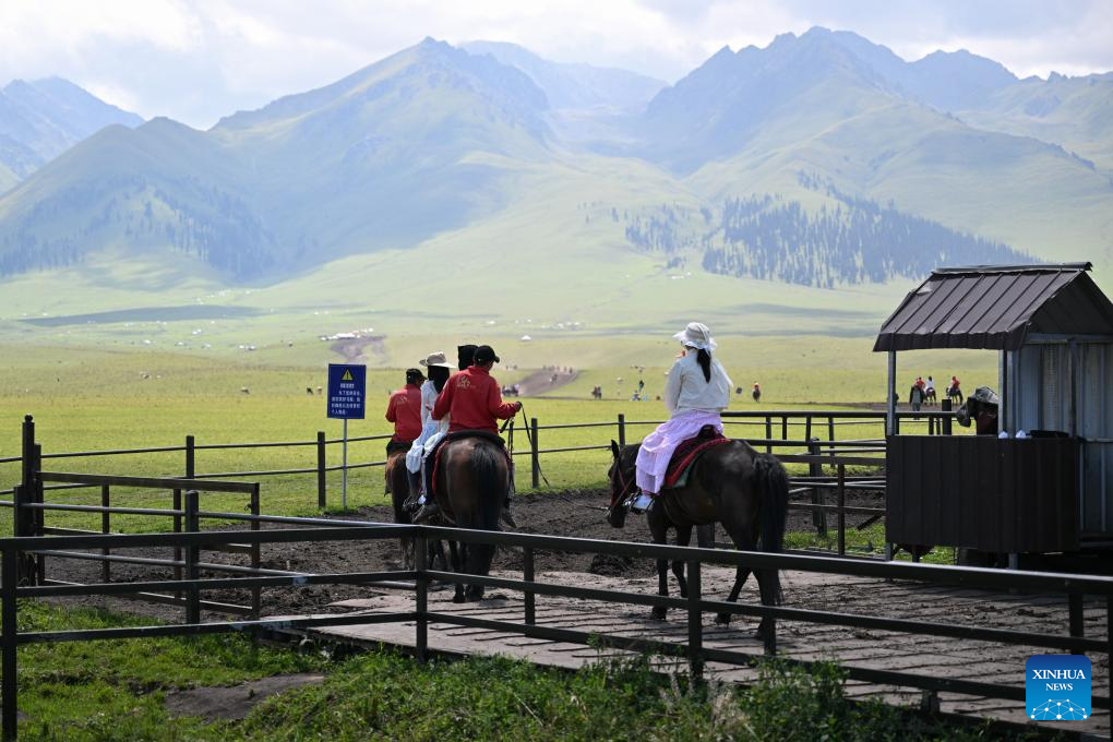 Tourists enjoy horseback riding on the Narat grassland in Ili Kazak Autonomous Prefecture, northwest China's Xinjiang Uygur Autonomous Region, Aug. 3, 2025. (Xinhua/Liu Lianfen)