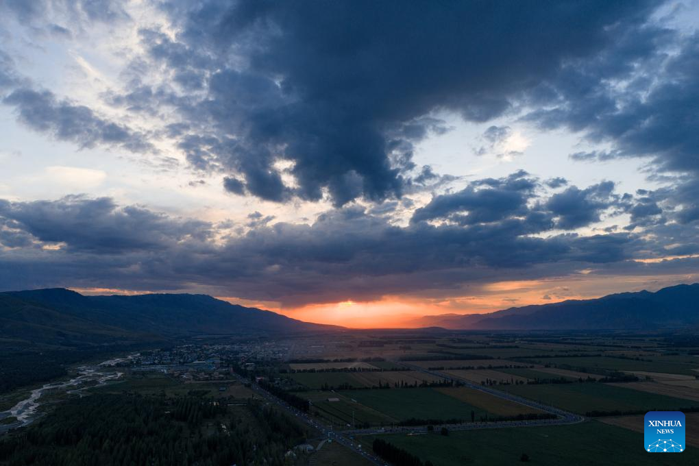 An aerial drone photo taken on Aug. 3, 2025 shows the sunset glow on the Narat grassland in Ili Kazak Autonomous Prefecture, northwest China's Xinjiang Uygur Autonomous Region. (Xinhua/Xin Yuewei)