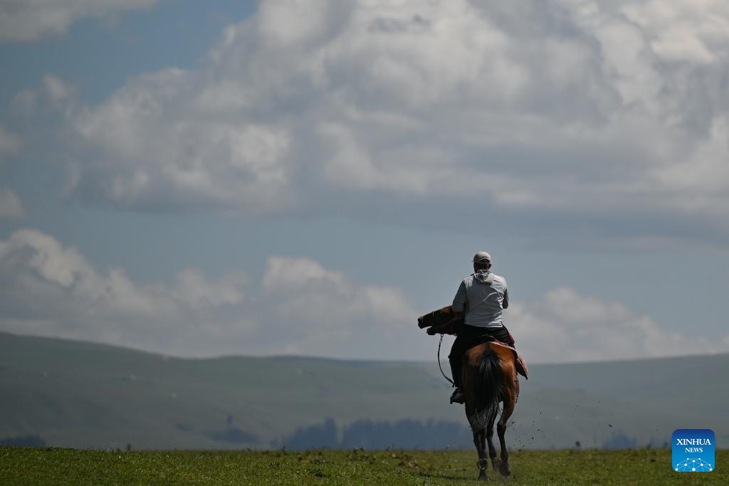 A man rides a horse on the Narat grassland in Ili Kazak Autonomous Prefecture, northwest China's Xinjiang Uygur Autonomous Region, Aug. 3, 2025. (Xinhua/Xin Yuewei)