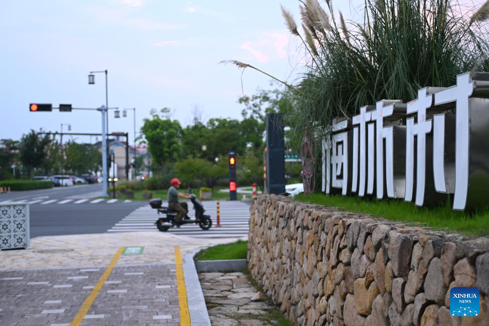 This photo taken on Aug. 4, 2025 shows an entrance to Meilin Village in Xiaoshan District of Hangzhou, east China's Zhejiang Province. Meilin, which has long been a model village for rural development, has been actively exploring ways to reduce pollution and carbon emissions in recent years. Through a series of measures such as promoting rooftop photovoltaic projects, building smart farmlands and integrated photovoltaic charging and storage stations, clean energy is being widely adopted here, injecting green impetus for the rural revitalization. (Xinhua/Mao Zhu)