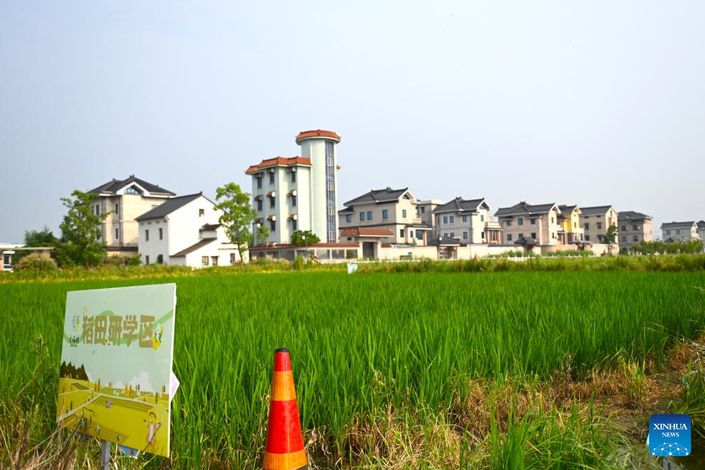 A paddy rice field for study tours is pictured at Meilin Village in Xiaoshan District of Hangzhou, east China's Zhejiang Province on Aug. 4, 2025. Meilin, which has long been a model village for rural development, has been actively exploring ways to reduce pollution and carbon emissions in recent years. Through a series of measures such as promoting rooftop photovoltaic projects, building smart farmlands and integrated photovoltaic charging and storage stations, clean energy is being widely adopted here, injecting green impetus for the rural revitalization. (Xinhua/Mao Zhu)