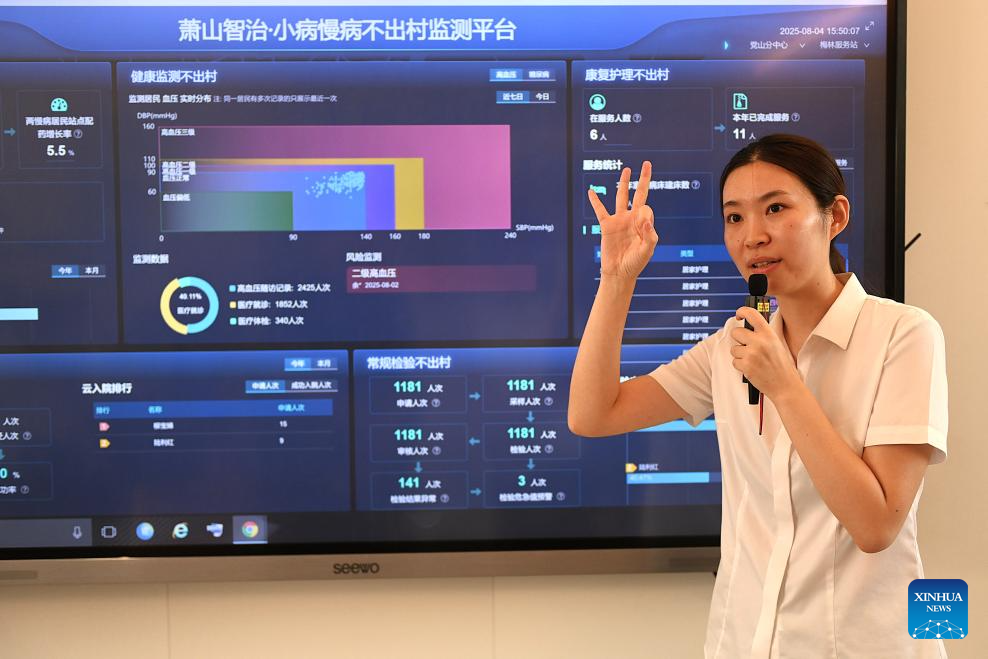 A staff member introduces a smart health monitoring platform at Meilin Village in Xiaoshan District of Hangzhou, east China's Zhejiang Province, on Aug. 4, 2025. Meilin, which has long been a model village for rural development, has been actively exploring ways to reduce pollution and carbon emissions in recent years. Through a series of measures such as promoting rooftop photovoltaic projects, building smart farmlands and integrated photovoltaic charging and storage stations, clean energy is being widely adopted here, injecting green impetus for the rural revitalization. (Xinhua/Mao Zhu)