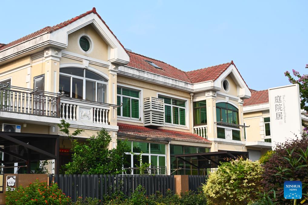 A house with courtyard for villagers is pictured at Meilin Village in Xiaoshan District of Hangzhou, east China's Zhejiang Province, on Aug. 4, 2025. Meilin, which has long been a model village for rural development, has been actively exploring ways to reduce pollution and carbon emissions in recent years. Through a series of measures such as promoting rooftop photovoltaic projects, building smart farmlands and integrated photovoltaic charging and storage stations, clean energy is being widely adopted here, injecting green impetus for the rural revitalization. (Xinhua/Mao Zhu)
