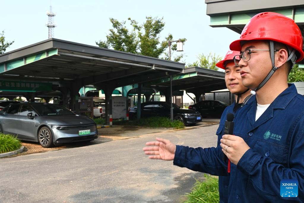 A technician introduces an integrated photovoltaic charging and storage station at Meilin Village in Xiaoshan District of Hangzhou, east China's Zhejiang Province, on Aug. 4, 2025. Meilin, which has long been a model village for rural development, has been actively exploring ways to reduce pollution and carbon emissions in recent years. Through a series of measures such as promoting rooftop photovoltaic projects, building smart farmlands and integrated photovoltaic charging and storage stations, clean energy is being widely adopted here, injecting green impetus for the rural revitalization. (Xinhua/Mao Zhu)
