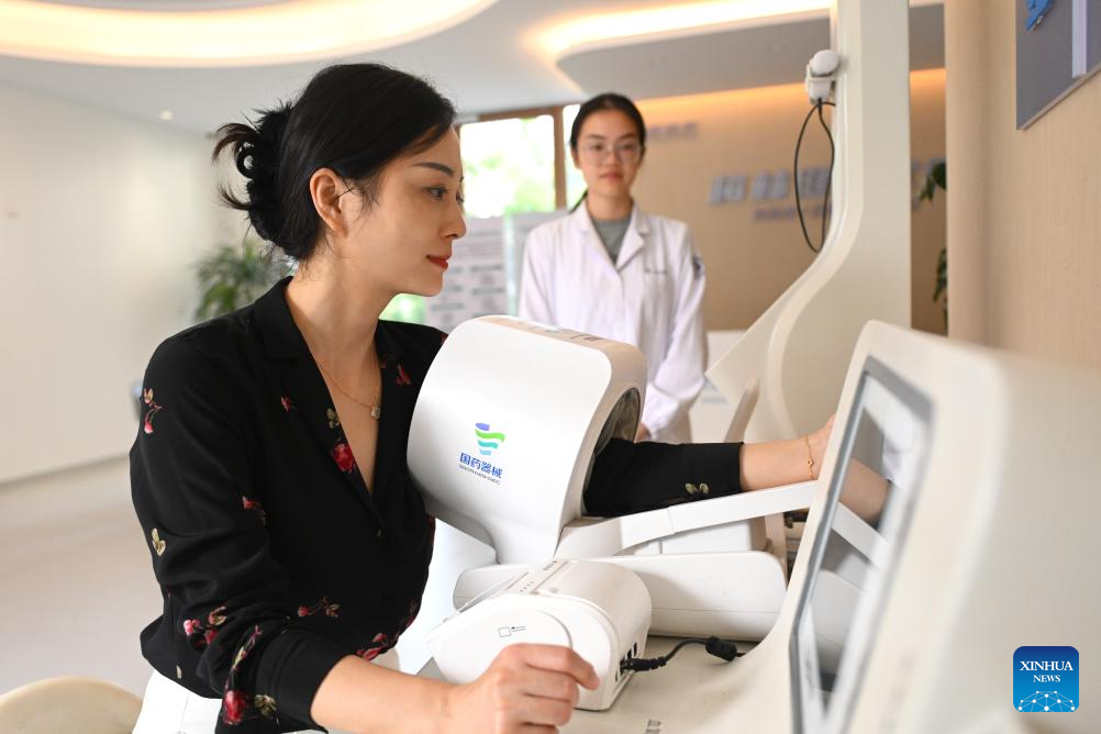 A woman measures blood pressure by herself at a smart health station of Meilin Village in Xiaoshan District of Hangzhou, east China's Zhejiang Province, on Aug. 4, 2025. Meilin, which has long been a model village for rural development, has been actively exploring ways to reduce pollution and carbon emissions in recent years. Through a series of measures such as promoting rooftop photovoltaic projects, building smart farmlands and integrated photovoltaic charging and storage stations, clean energy is being widely adopted here, injecting green impetus for the rural revitalization. (Xinhua/Mao Zhu)