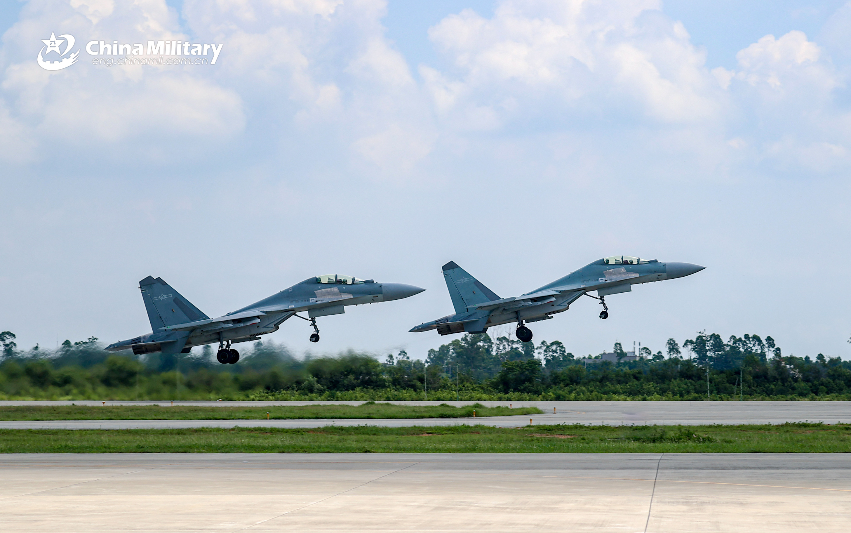Two J-16 multi-role fighter jets attached to a unit of the air Force under the Chinese PLA Southern Theater Command take off in formation during a flight training exercise. (eng.chinamil.com.cn/Photo by Wang Xinwei)