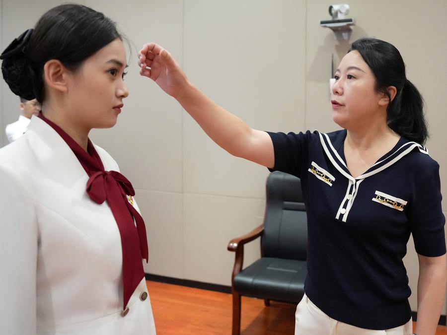 Shi Renhua (R) helps a colleague get prepared for a public event in Dadong District of Shenyang, northeast China's Liaoning Province, July 22, 2025. (Xinhua/Li Gang)