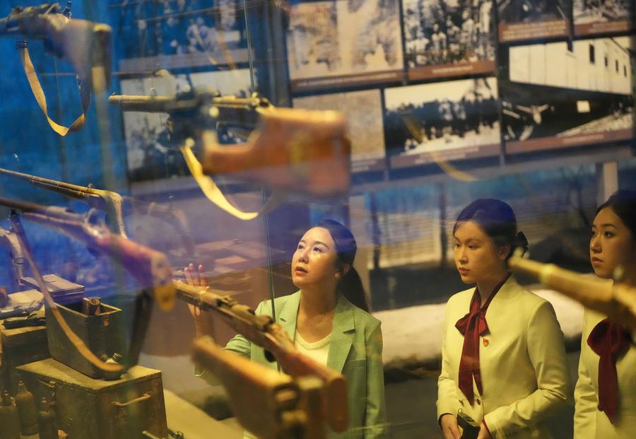 Shi Renhua (1st L) and her colleagues check exhibits at the 9.18 Historical Museum in Shenyang, northeast China's Liaoning Province, July 28, 2025. (Xinhua/Li Gang)