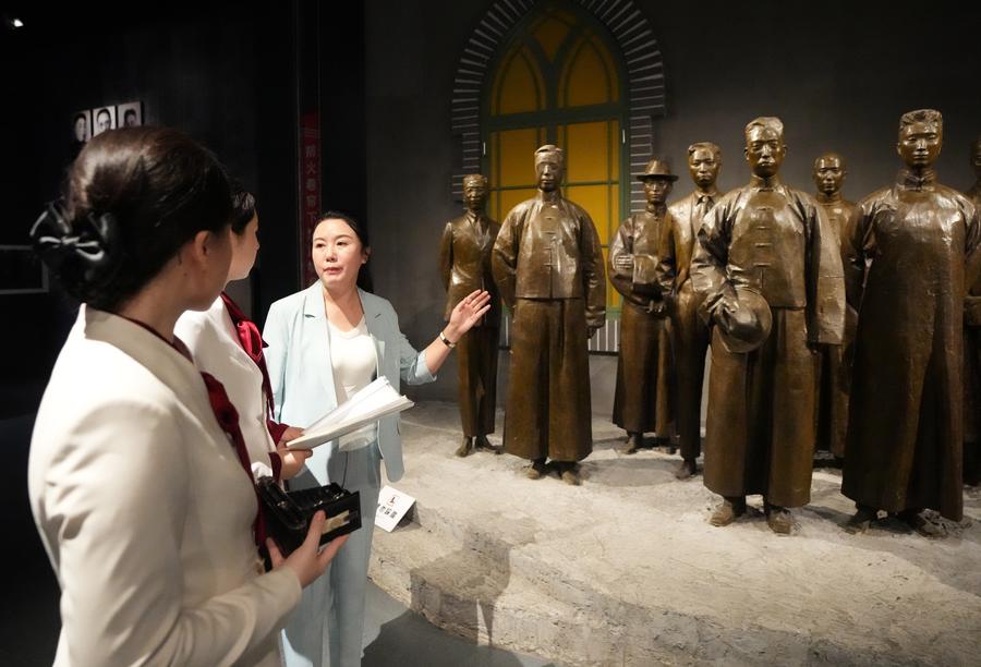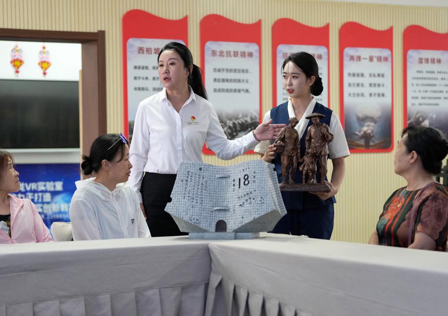 Shi Renhua (1st R) discusses with her colleagues on improvement in docent service at the 9.18 Historical Museum in Shenyang, northeast China's Liaoning Province, Aug. 4, 2025. (Xinhua/Li Gang)