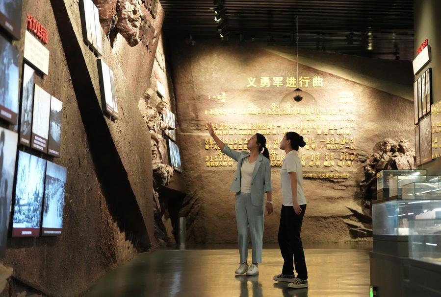 Shi Renhua (L) discusses with her colleague on improvement in docent service at the 9.18 Historical Museum in Shenyang, northeast China's Liaoning Province, July 28, 2025. (Xinhua/Li Gang)