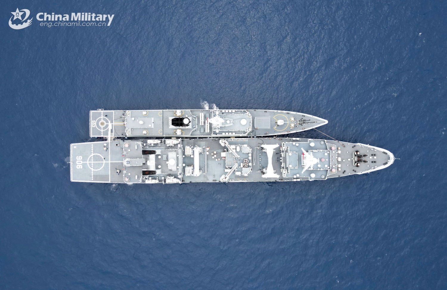 The guided-missile frigate Dali (Hull 553) attached to a flotilla with the navy under the Chinese PLA Southern Theater Command practices replenishment-at-sea with the comprehensive supply ship Honghu (Hull 906) during a maritime emergency supply training exercise in late July, 2025. (eng.chinamil.com.cn/Photo by Lyu Ge)