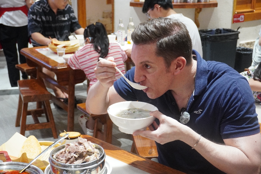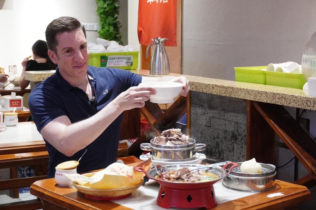 Spanish traveler Alvaro Lago recently got a taste of Xuzhou's thousand-year-old tradition of steaming mutton broth at a local restaurant in Xuzhou, east China's Jiangsu Province.