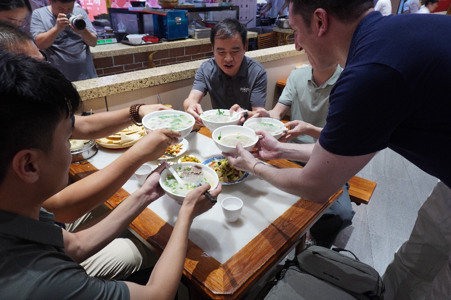 Spanish traveler Alvaro Lago toasts local diners with steaming bowls of mutton broth in Xuzhou, east China's Jiangsu Province, August 1, 2025. (People's Daily Online/Yu Liang)