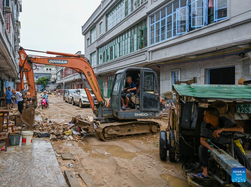 A man drives an excavator to clear silt and debris in Huanghua Village of Qingyuan City, south China's Guangdong Province, Aug. 6, 2025. China's national commission for disaster prevention, reduction and relief on Wednesday initiated a Level-IV emergency response in Guangdong Province due to heavy rainfall and severe flooding, according to the Ministry of Emergency Management. The southern province has been experiencing heavy rain since the beginning of the week, with the provincial meteorological observatory alarming about geological disasters, urban waterlogging and mountain torrents. (Xinhua/Xiao Ennan)