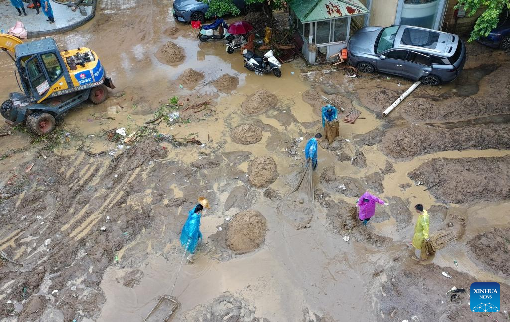 Staff members clear silt in Dinghu District of Zhaoqing City, south China's Guangdong Province, Aug. 6, 2025. China's national commission for disaster prevention, reduction and relief on Wednesday initiated a Level-IV emergency response in Guangdong Province due to heavy rainfall and severe flooding, according to the Ministry of Emergency Management. The southern province has been experiencing heavy rain since the beginning of the week, with the provincial meteorological observatory alarming about geological disasters, urban waterlogging and mountain torrents. (Xinhua/Xiao Ennan)