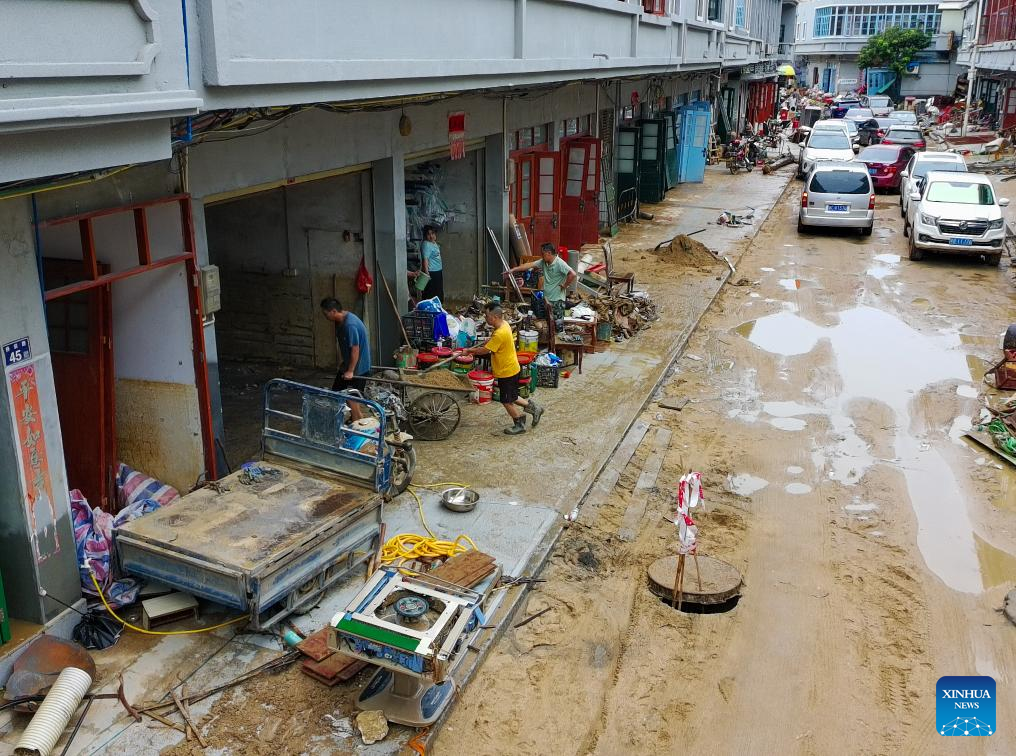An aerial drone photo taken on Aug. 6, 2025 shows villagers clearing silt and debris in Huanghua Village of Qingyuan City, south China's Guangdong Province. China's national commission for disaster prevention, reduction and relief on Wednesday initiated a Level-IV emergency response in Guangdong Province due to heavy rainfall and severe flooding, according to the Ministry of Emergency Management. The southern province has been experiencing heavy rain since the beginning of the week, with the provincial meteorological observatory alarming about geological disasters, urban waterlogging and mountain torrents. (Xinhua/Xiao Ennan)