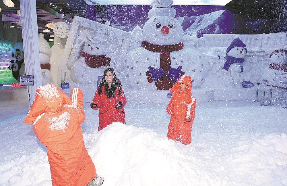 Visitors play at an indoor snow-themed entertainment zone in Harbin, Heilongjiang province, on July 9. LIU YANG/FOR CHINA DAILY