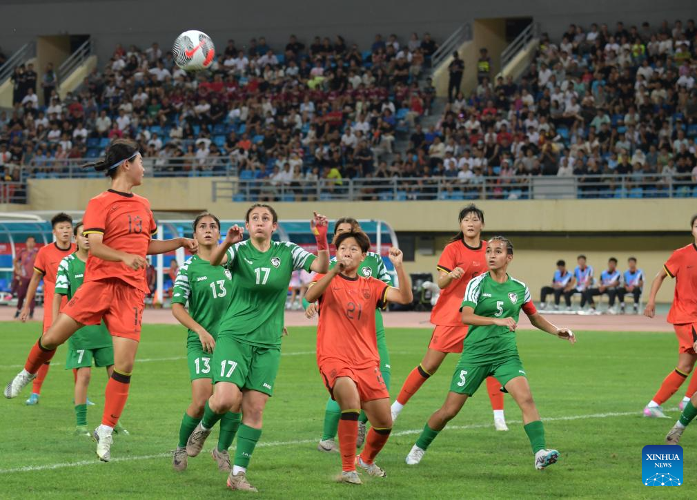 Xiao Yafei (L, top) of China heads the ball during the Group E football match between China and Syria at the AFC U20 Women's Asian Cup Qualifiers in Yinchuan, northwest China's Ningxia Hui Autonomous Region, Aug. 6, 2025. (Photo by Gao Xiaogang/Xinhua)