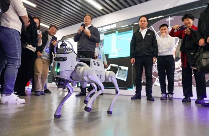 A robotic dog developed by a tech firm in the Future Science and Technology City in Hangzhou, east China's Zhejiang province, is trained to conduct fire patrols. (Photo/Zhang Yongtao)