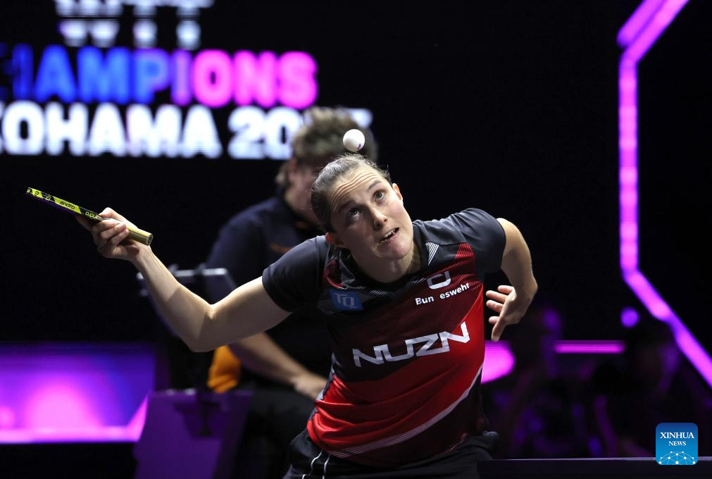 Sabine Winter serves during the women's singles round of 32 match between Wang Yidi of China and Sabine Winter of Germany at the WTT Champions Yokohama 2025 in Yokohama, Japan, Aug. 7, 2025. (Xinhua/Yue Chenxing)