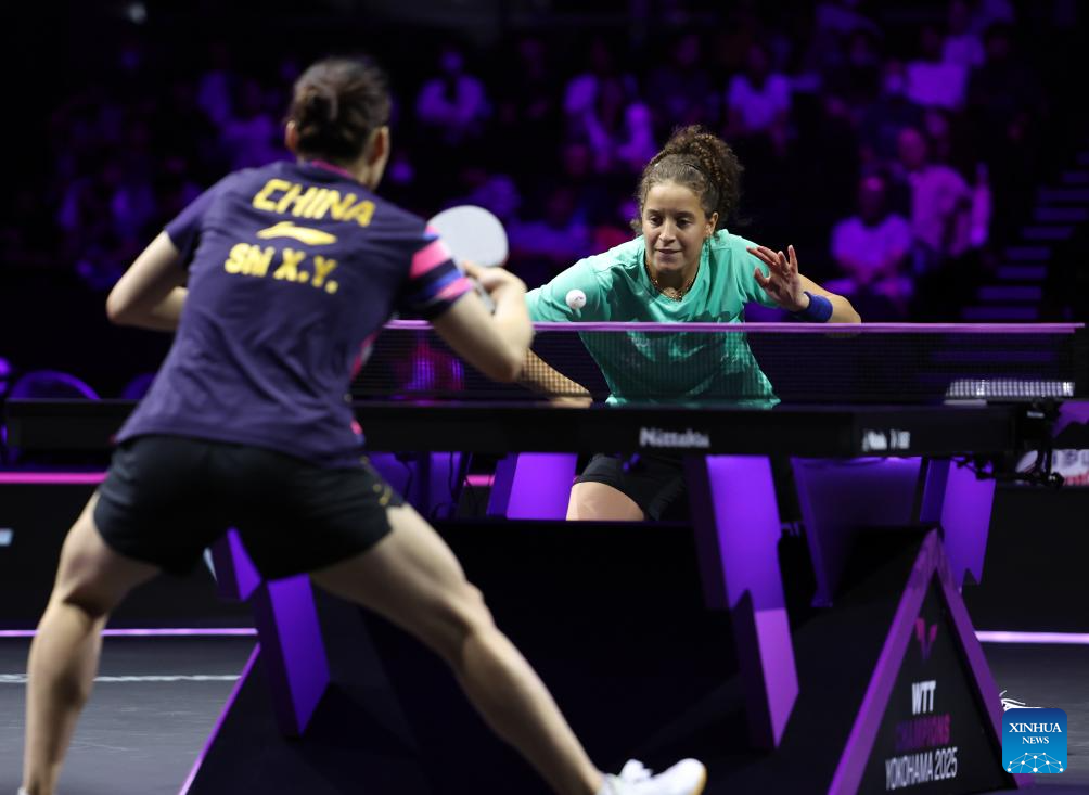 Wang Yidi returns the ball during the women's singles round of 32 match between Wang Yidi of China and Sabine Winter of Germany at the WTT Champions Yokohama 2025 in Yokohama, Japan, Aug. 7, 2025. (Xinhua/Yue Chenxing)