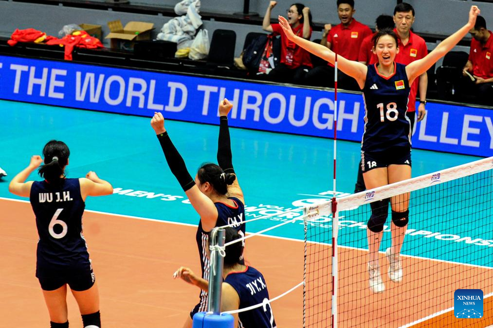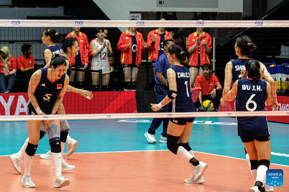 Shan Linqian (R) of China celebrates scoring with teammates during the women's preliminary phase pool B match between China and Croatia at the Volleyball Women's U21 World Championship in Surabaya, East Java province, Indonesia, on Aug. 7, 2025. (Photo by Sahlan Kurniawan/Xinhua)