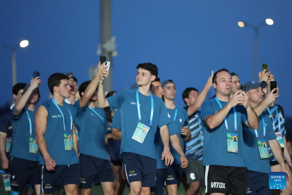 Members of the delegation of Argentina arrive for the opening ceremony of the World Games 2025 in Chengdu, southwest China's Sichuan Province, on Aug. 7, 2025. (Xinhua/Jiang Kehong)