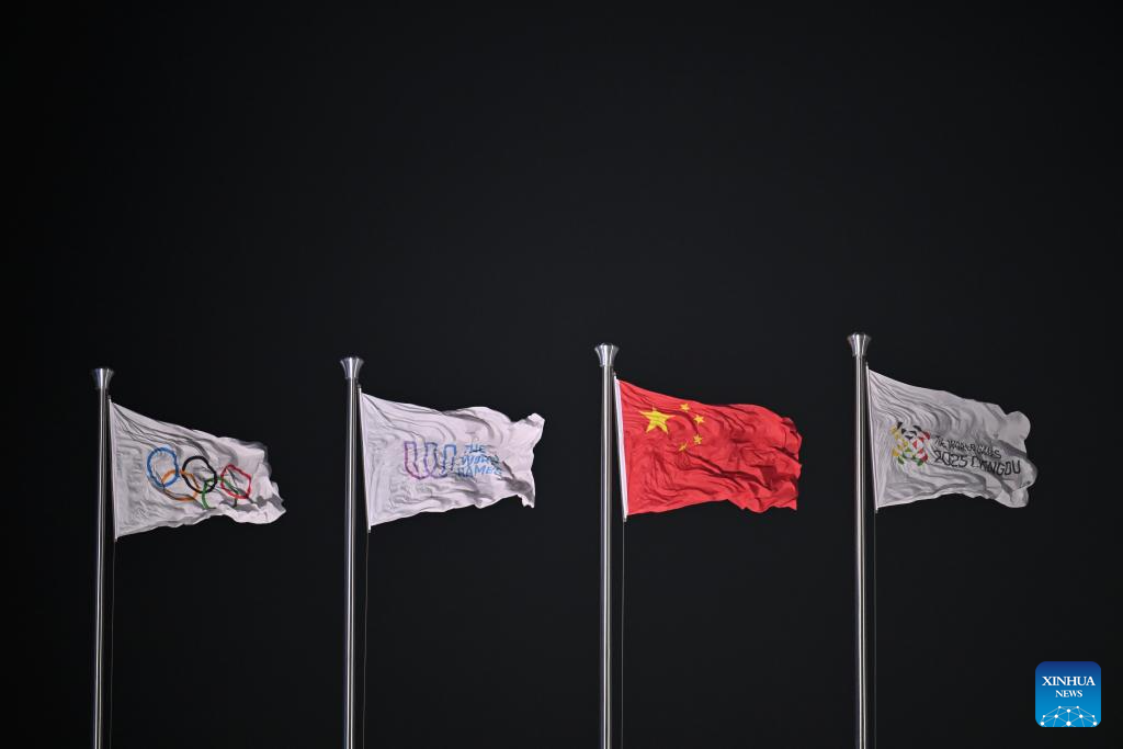 The flag of the International Olympic Committee, the flag of the International World Games Association, the Chinese national flag and the flag of the Organising Committee of the World Games 2025 Chengdu (L to R) are seen during the opening ceremony of the World Games 2025 in Chengdu, southwest China's Sichuan Province, on Aug. 7, 2025. (Xinhua/Chen Zhenhai)