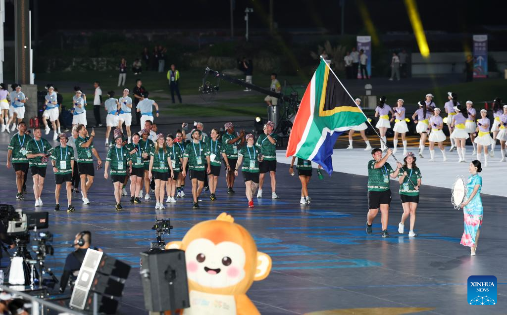 Members of the delegation of South Africa parade during the opening ceremony of the World Games 2025 in Chengdu, southwest China's Sichuan Province, on Aug. 7, 2025. (Xinhua/Jiang Kehong)