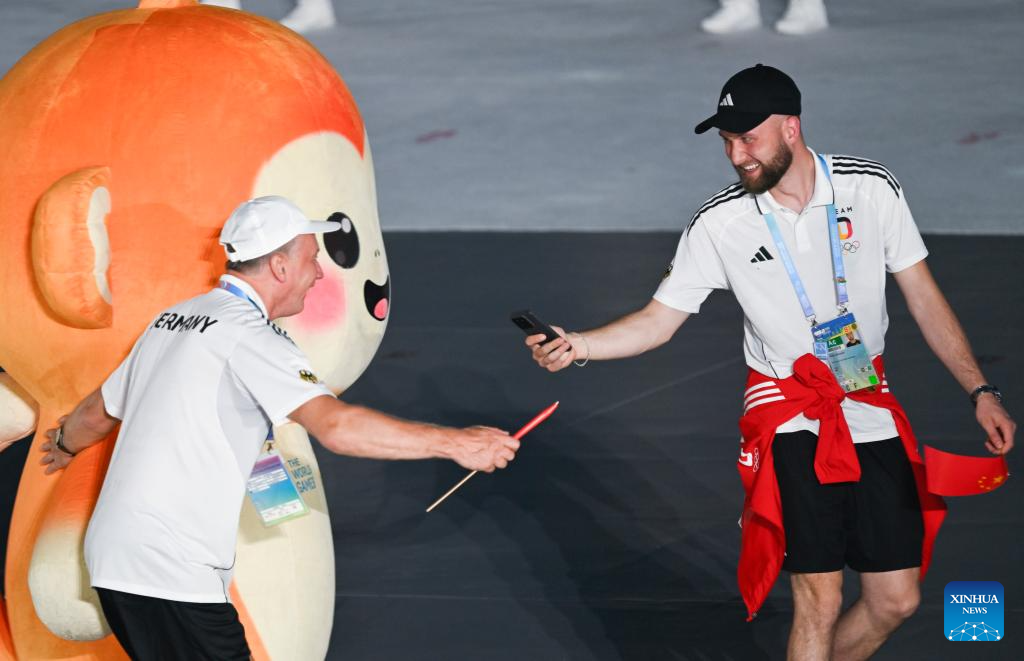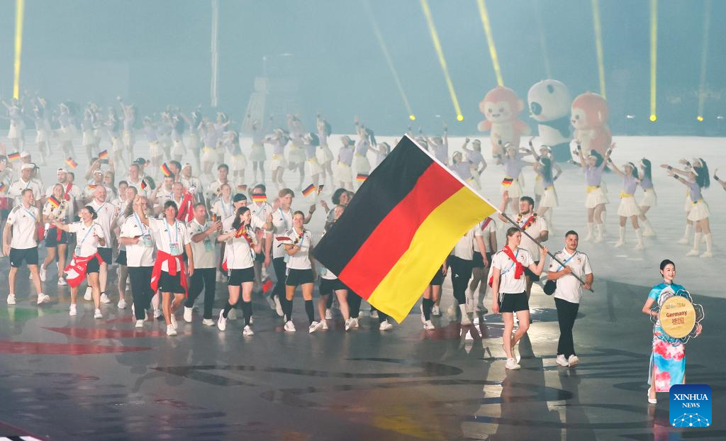 Members of the delegation of Germany arrive for the opening ceremony of the World Games 2025 in Chengdu, southwest China's Sichuan Province, on Aug. 7, 2025. (Xinhua/Jiang Kehong)