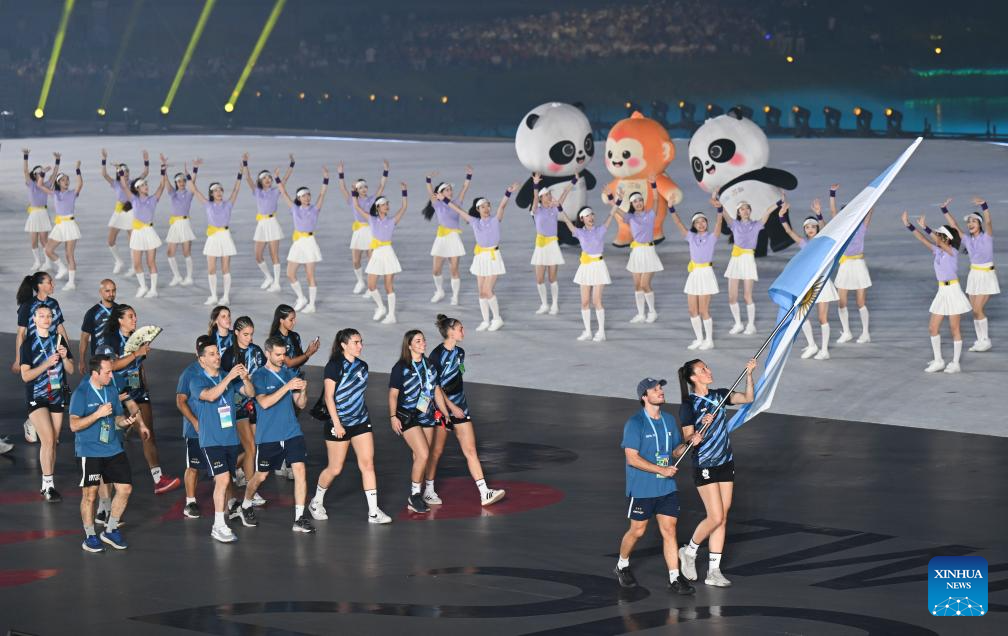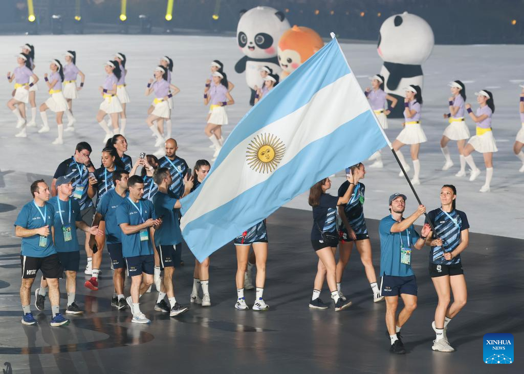 Members of the delegation of Argentina parade during the opening ceremony of the World Games 2025 in Chengdu, southwest China's Sichuan Province, on Aug. 7, 2025. (Xinhua/Du Zixuan)