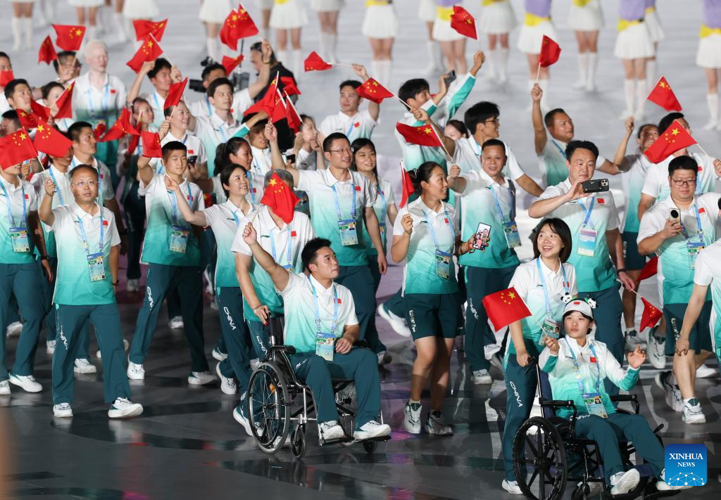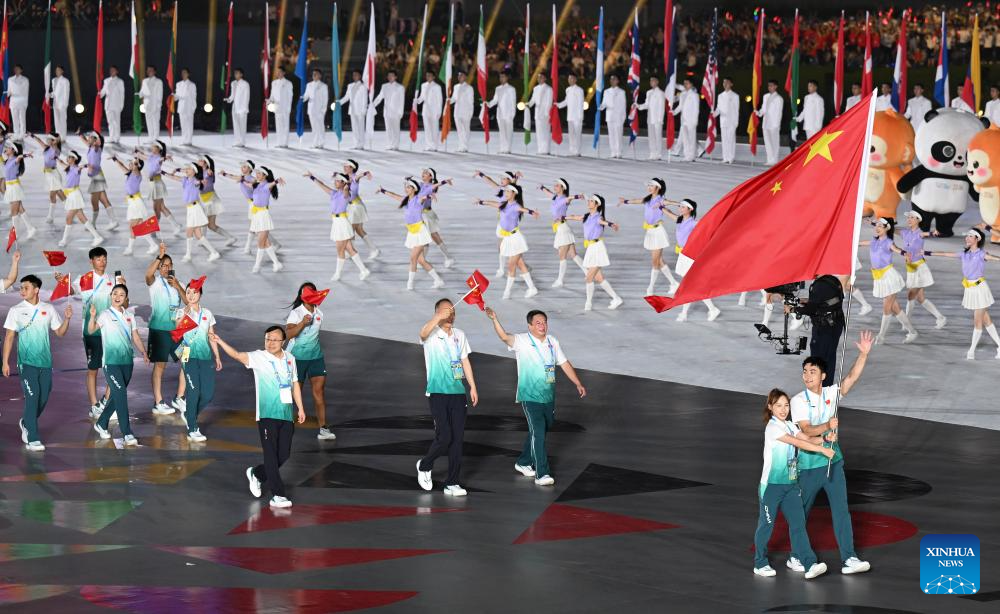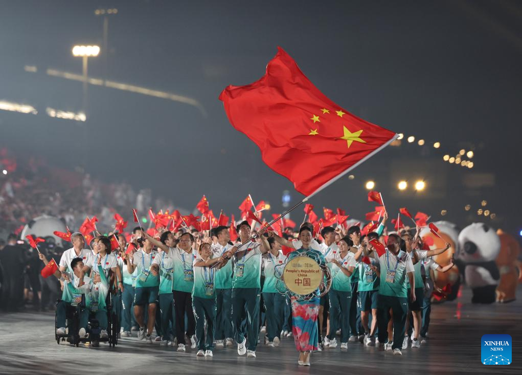 Members of the delegation of China parade during the opening ceremony of the World Games 2025 in Chengdu, southwest China's Sichuan Province, on Aug. 7, 2025. (Xinhua/Chen Bin)