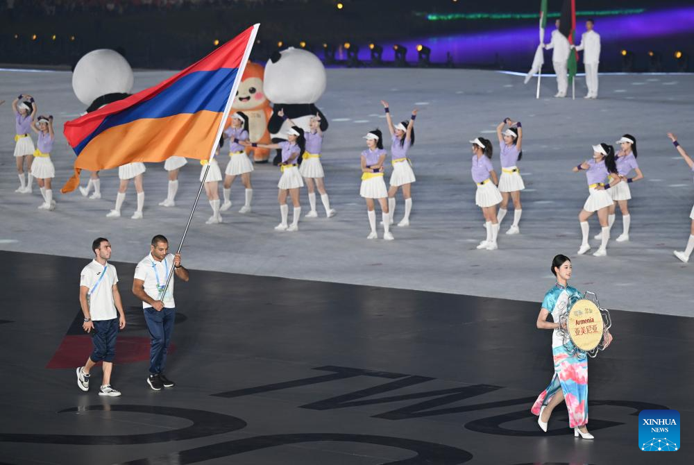 Members of the delegation of Armenia parade during the opening ceremony of the World Games 2025 in Chengdu, southwest China's Sichuan Province, on Aug. 7, 2025. (Xinhua/Du Zixuan)