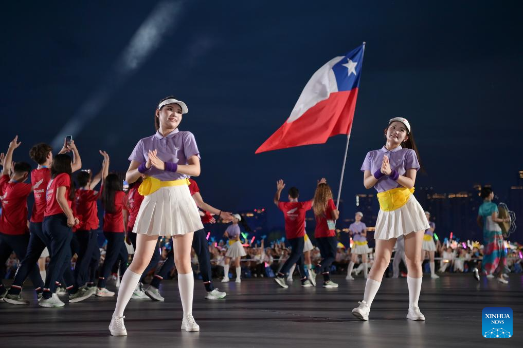 Volunteers welcome the delegation of Chile during the opening ceremony of the World Games 2025 in Chengdu, southwest China's Sichuan Province, on Aug. 7, 2025, (Xinhua/Jiang Han)