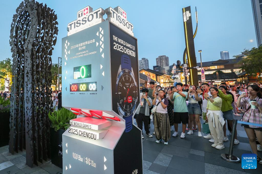People take photos of a countdown clock in Taikoo Li Chengdu as the opening ceremony of the World Games 2025 begin in Chengdu, southwest China's Sichuan Province, on Aug. 7, 2025. (Xinhua/Zhang Liyun)