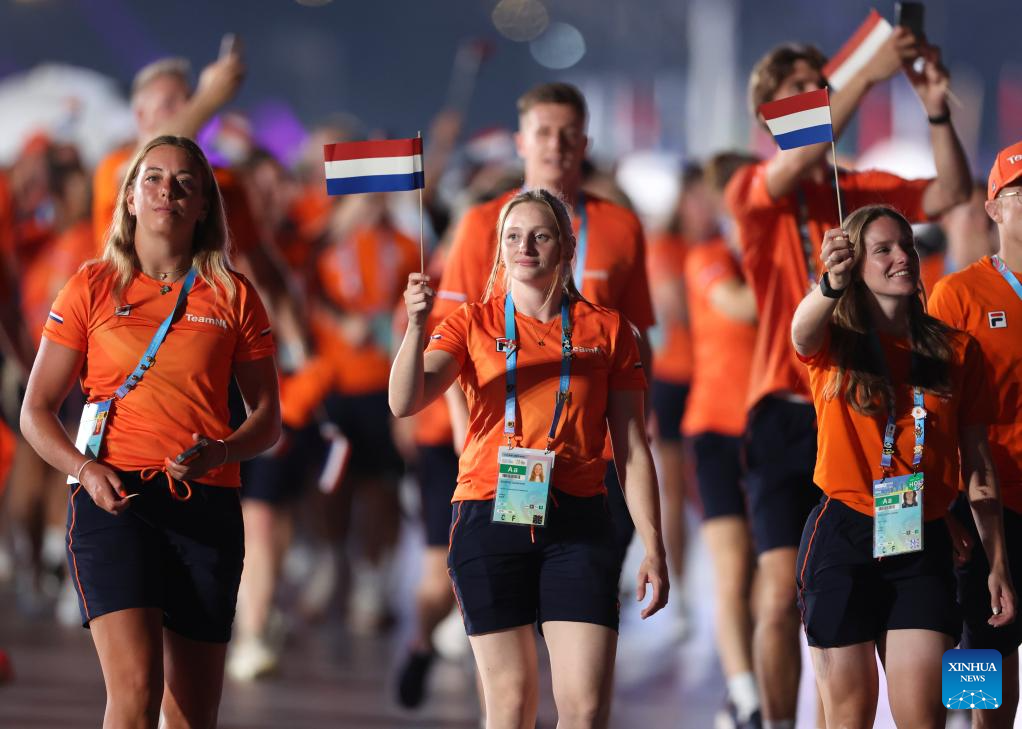 Members of the delegation of the Netherlands parade during the opening ceremony of the World Games 2025 in Chengdu, southwest China's Sichuan Province, on Aug. 7, 2025. (Xinhua/Chen Bin)