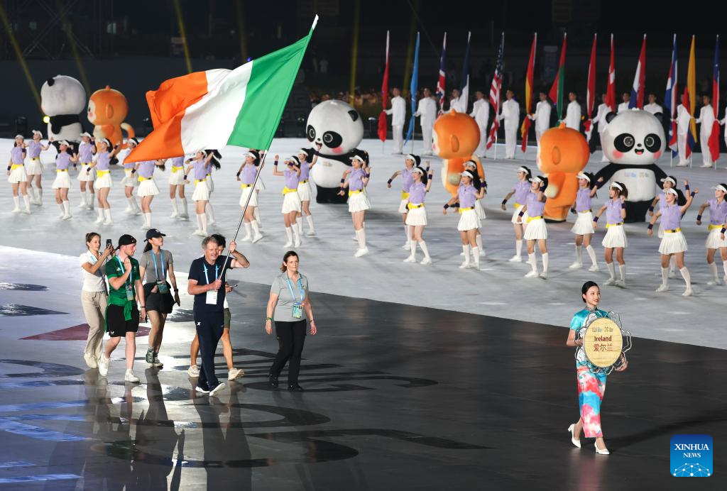 Members of the delegation of Ireland parade during the opening ceremony of the World Games 2025 in Chengdu, southwest China's Sichuan Province, on Aug. 7, 2025. (Xinhua/Jiang Kehong)