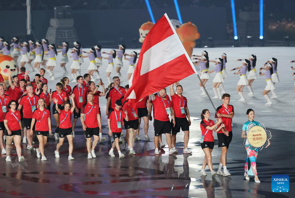 Members of the delegation of Austria parade during the opening ceremony of the World Games 2025 in Chengdu, southwest China's Sichuan Province, on Aug. 7, 2025. (Xinhua/Jiang Kehong)