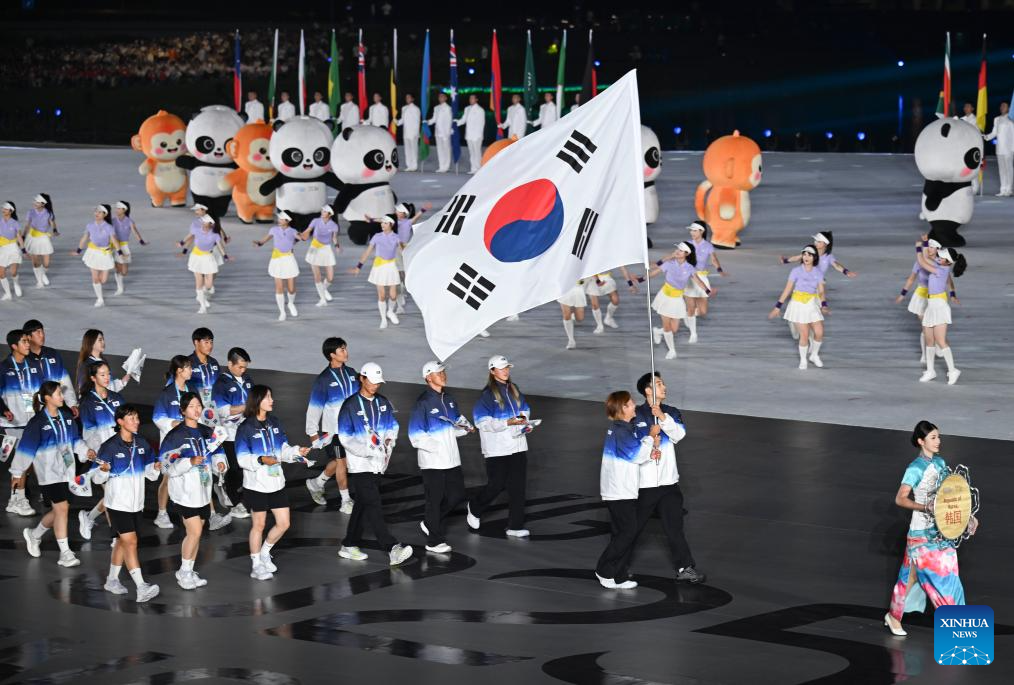Members of the delegation of South Korea parade during the opening ceremony of the World Games 2025 in Chengdu, southwest China's Sichuan Province, on Aug. 7, 2025. (Xinhua/Du Zixuan)